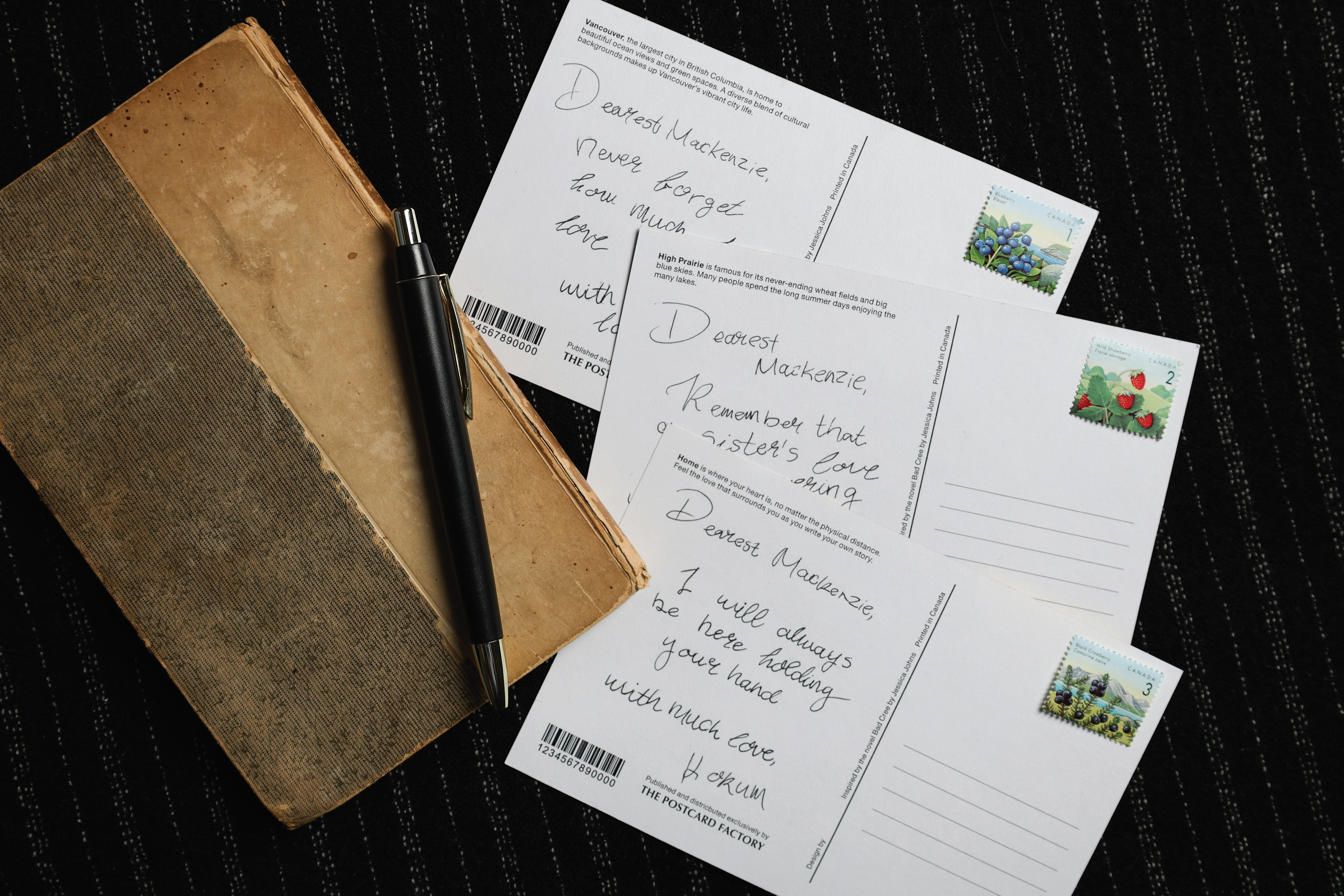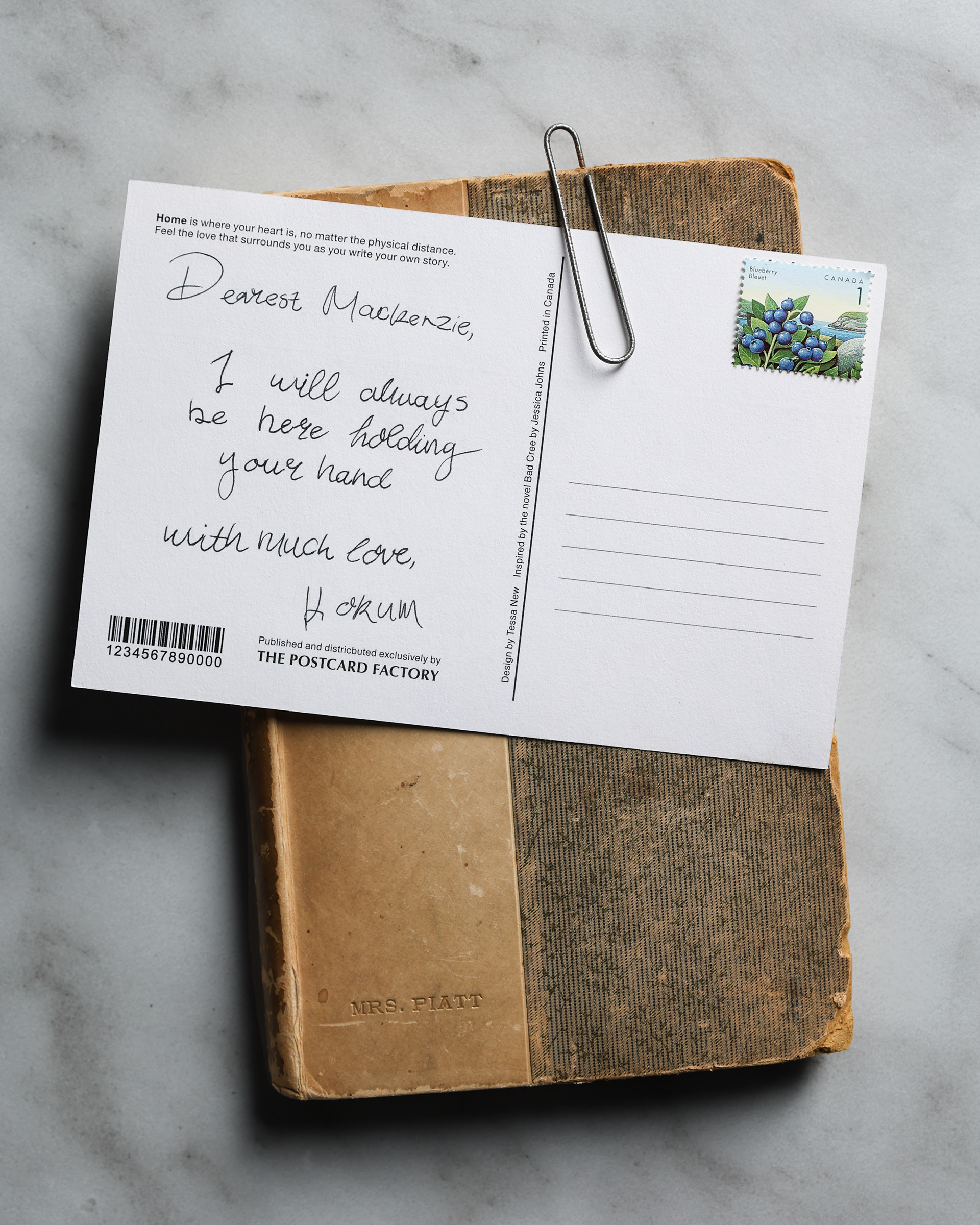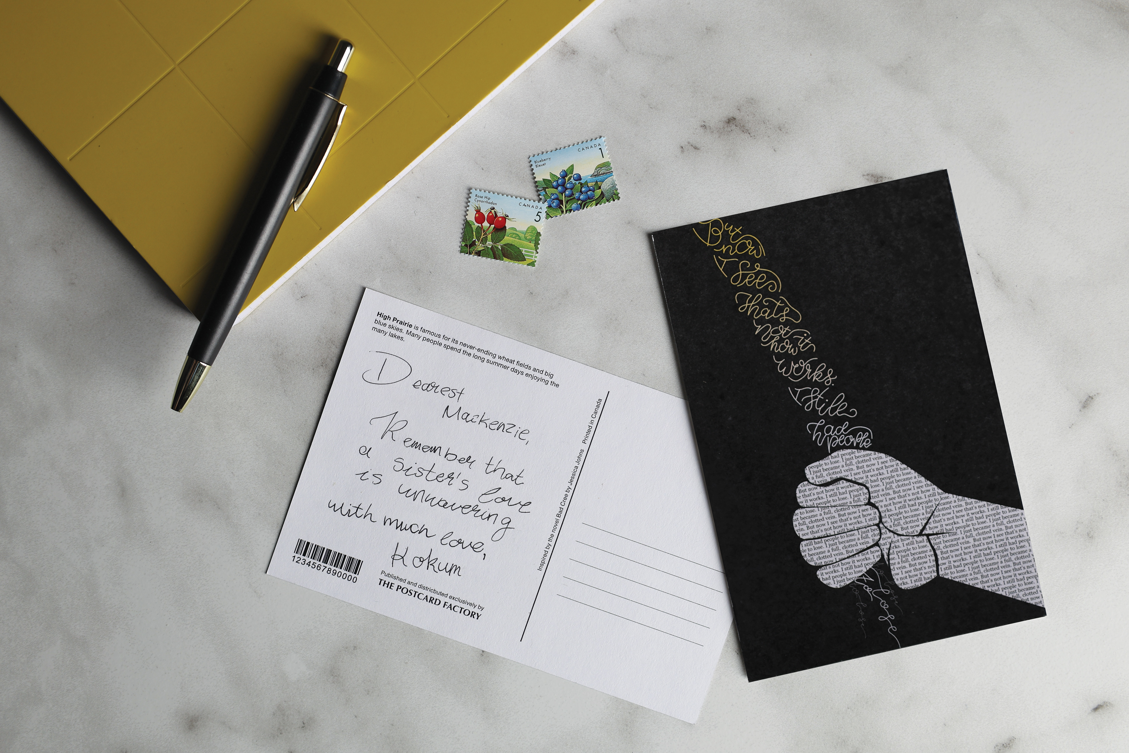 Each postcard features a small explanation of the place in which that stage of grief took place. The messages written to Mackenzie from her Kokum are figurative reminders of the lessons she instilled in her from childhood.