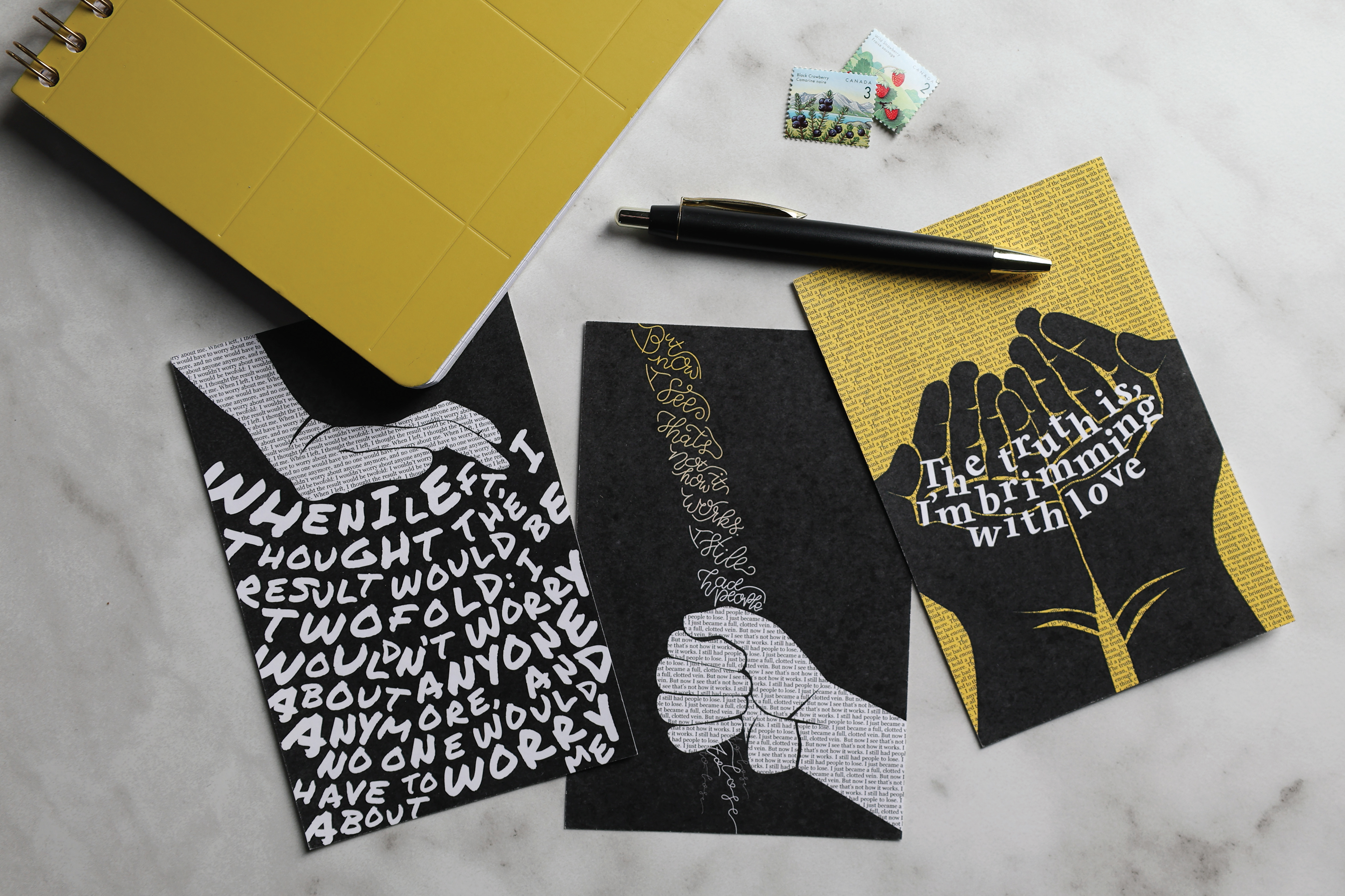 The project goal was to create expressive typographic postcards based on the novel Bad Cree by Jessica Johns. The concept was to show the progression of the main character, Mackenzie, through grief as she experiences states of denial, reflection and acceptance. The novel uses strong imagery of hands, particularly the Kokum’s hands, which inspired the visual depictions.